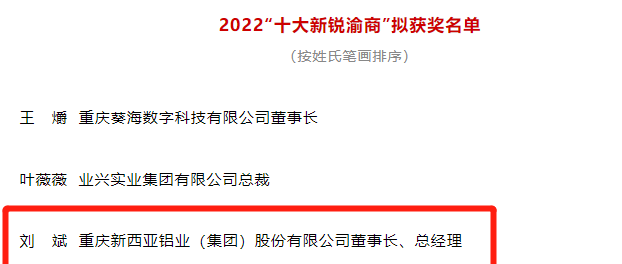 喜報!熱烈祝賀新西亞鋁業(集團)股份有限公司總經理榮獲“2022十大新銳渝商”稱號