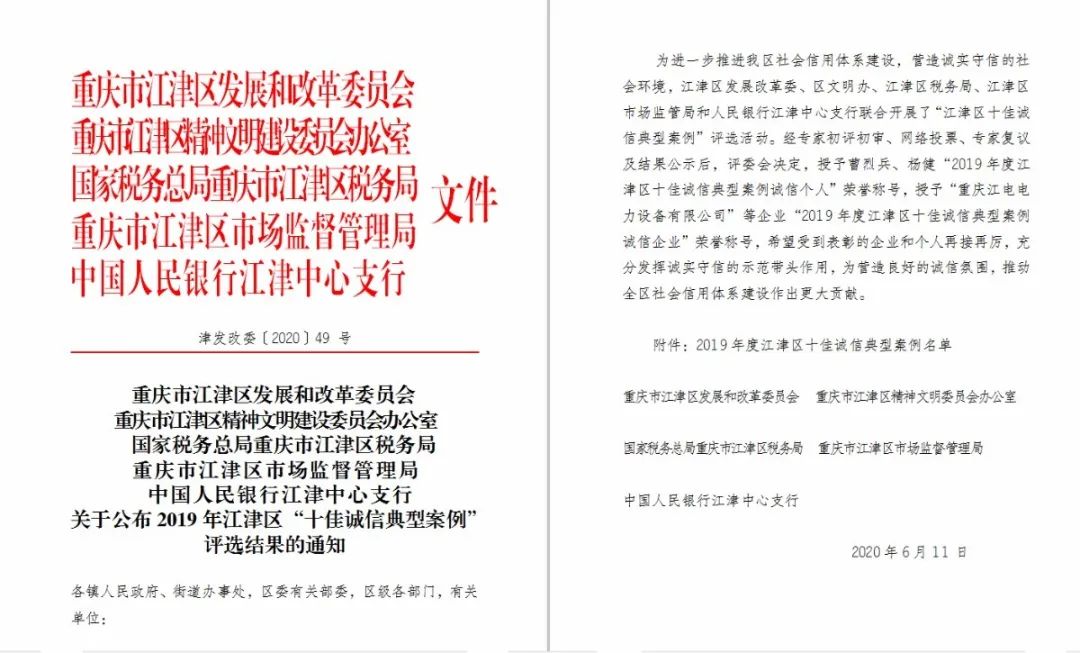 “江津區(qū)十佳誠信典型案例”活動(dòng)是由江津區(qū)發(fā)展改革委、區(qū)文明辦、區(qū)稅務(wù)局、區(qū)市場監(jiān)管局和人民銀行江津支行聯(lián)合舉辦。活動(dòng)經(jīng)過前期征集、專家初評(píng)、網(wǎng)絡(luò)投票、專家復(fù)議層層選拔,最終評(píng)選出2名“2019年度江津區(qū)十佳誠信典型案例誠信個(gè)人”稱號(hào);8家“2019年度江津區(qū)十佳誠信典型案例誠信企業(yè)”榮譽(yù)稱號(hào)。