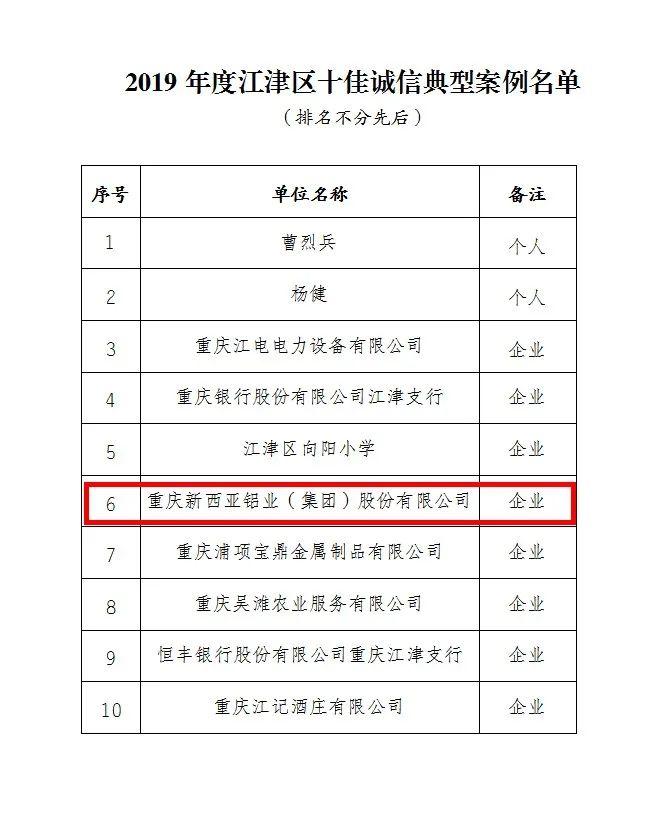 為進(jìn)一步推進(jìn)江津區(qū)社會(huì)信用體系建設(shè),營造誠實(shí)守信的社會(huì)環(huán)境。近日,重慶市江津區(qū)發(fā)展和改革委員會(huì)發(fā)文表彰2019年年度十佳誠信典型案例誠信企業(yè)。重慶新西亞鋁業(yè)(集團(tuán))股份有限公司成功入選,被江津區(qū)授予“2019年度十佳誠信典型案例誠信企業(yè)”榮譽(yù)稱號(hào)!