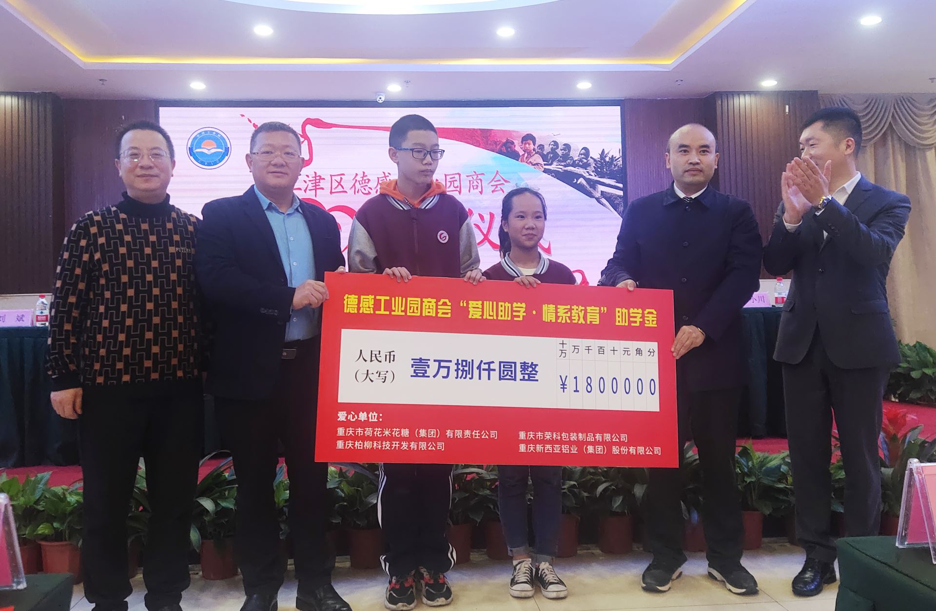 2020年10月16日,江津區德感工業園商會第三屆一次會員大會在禾宴大酒店隆重舉行,作為本次會議主要議程,會員企業—重慶市荷花米花糖(集團)有限公司、重慶市榮科包裝制品有限公司、重慶柏柳開發有限公司、重慶新西亞鋁業(集團)股份有限公司,共同出席了“愛心助學·情系教育”活動儀式。江津區委常委、區委統戰部部長楊利,江津區委常委、德感工業園發展中心黨委書記、主任李祖明,德感工業園發展中心黨委委員、副主任朱志明,江津區工商聯(總商會)主席鄒勇,江津區工商聯(總商會)副主席廖代旭、江津團區委副書記陳奕池、江津區實驗中學副校長柴瑛及德感商會92名會員共同見證了這一時刻。