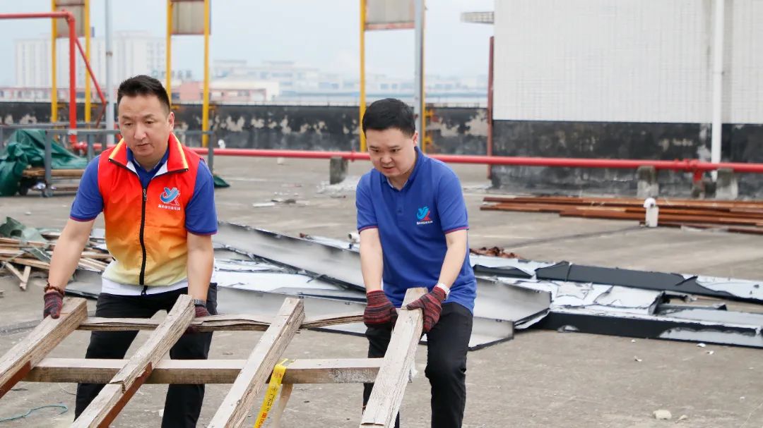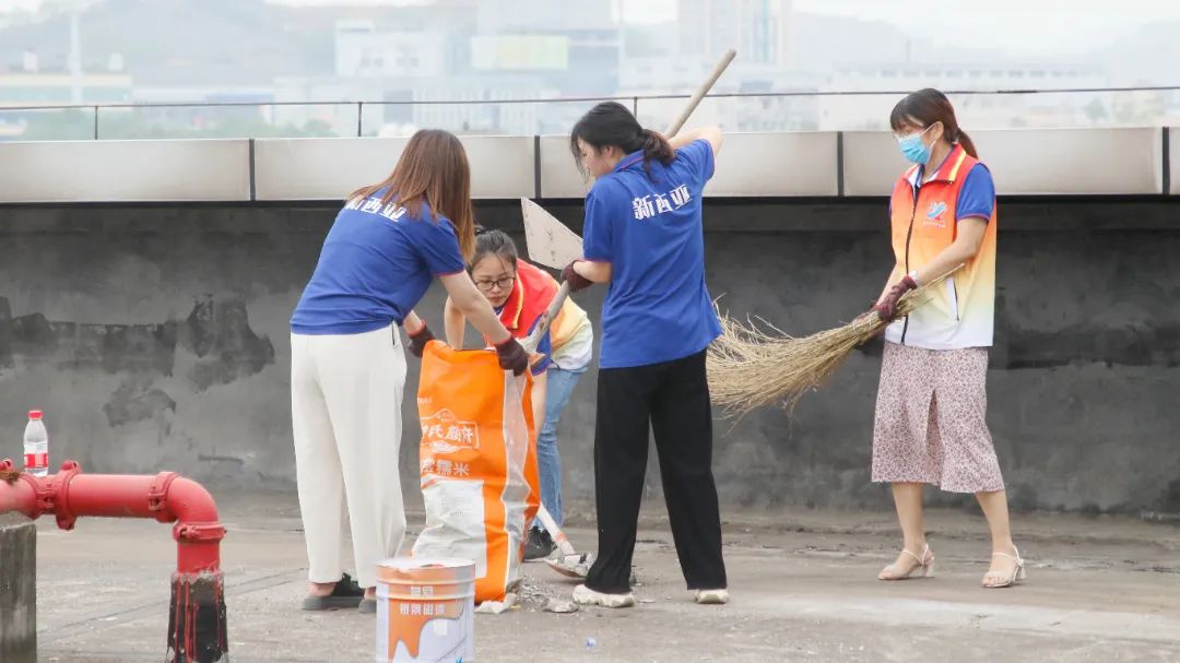 勞動中,大家忘記了自己的年齡、性別,個個不甘落后,搶著去干重活、臟活、累活……勞動的汗水浸濕了大家身上的衣裳,同時也換來了“收獲的喜悅”。經過近兩個半小時的辛勤勞動,讓原來雜亂的廠房頂樓煥然一新。