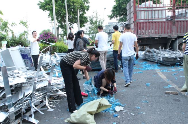 數月來,公司生產持續繁忙,每天都將產生大量的邊角余料,這些廢料如不及時處理,將嚴重影響公司正常生產。為此,公司黨支部“急生產所急”,適時組織了這次義務勞動。勞動內容:把粘貼在鋁板邊角余料上的保護膜一塊一塊撕下來,然后進行打包處理。在整個勞動現場,從總經理到一般員工,從共產黨員到普通群眾,大家心往一處想、勁往一處使,挽起衣袖,談笑風生,不叫苦不叫累,人人干得汗流浹背、熱火朝天。表現出新西亞人積極樂觀,甘于奉獻的高尚情操。夜色慢慢降臨,參加義務勞動的全體人員越干越歡,穿梭忙碌的身影,伴隨著燈光閃爍,在活動現場形成了一道亮麗的風景線。經過兩個半小時的辛勤付出,中庭廣場中堆積如山近20噸的廢鋁邊角余料終于全部清理完畢。